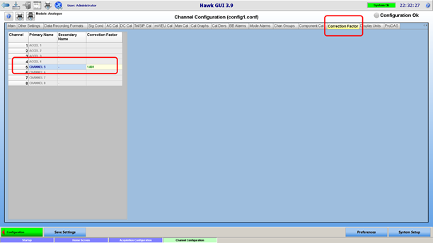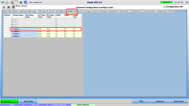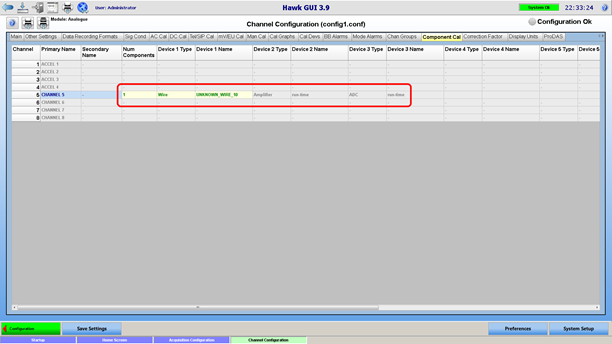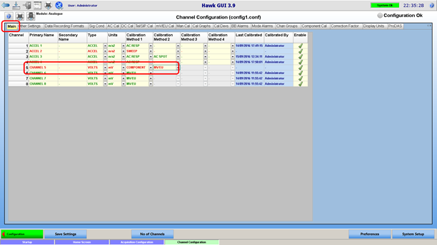 Then he/she will define the measurement chain for this channel, in the component cal tab of the Channel Configuration screen. The tab may need to be activated first in the preferences: